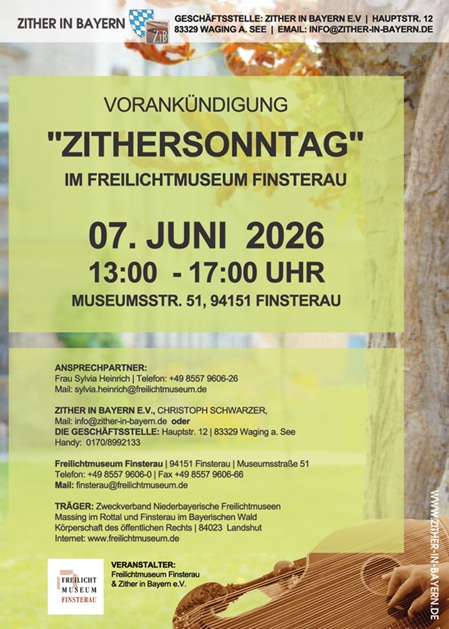 Ansprechpartner: Frau Sylvia Heinrich, Telefon +49 8557 9606-0, Mail: finsterau@freilichtmuseum.de, oder Zither in Bayern e.V., Christoph Schwarzer, Mail: info@zither-in-bayern.de oder die Geschäftsstelle: Hauptstr. 12, 83329 Waging a. See; Tel. 0170/8992133, Veranstalter: Freilichtmuseum Finsterau und Zither in Bayern e.V.