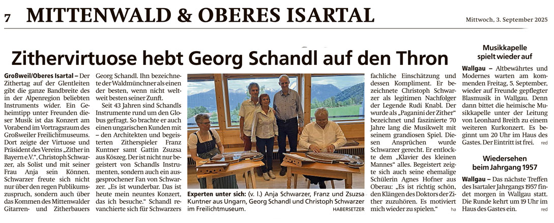 Einmal mehr, zeigten die Zithertage auf der Glentleiten die Vielfalt und den musikalischen Reichtum (traditionellen bayerischen und böhmischen Volksmusik zu klassisch konzertanten Werken von u.a. Johann Sebastian Bach, Edward Grieg und Richard Wagner bis zu Popmusik-Evergreens wie “Yesterday” von den Beatles) dieses faszinierenden Instruments Zither.