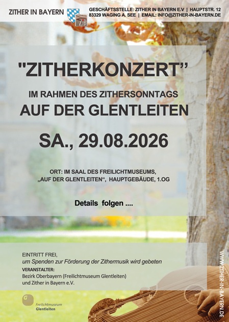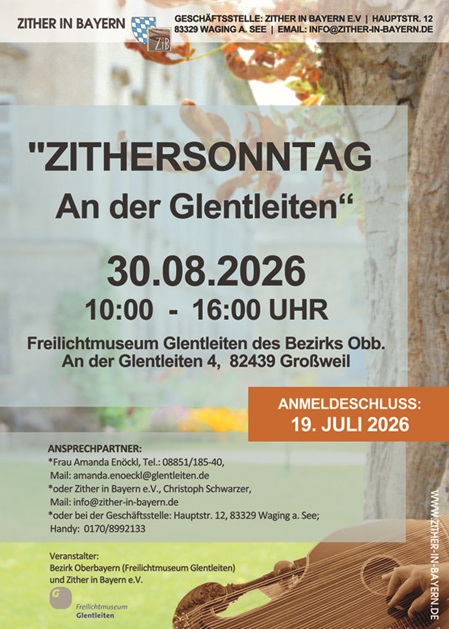 Ansprechpartner: Frau Amanda Enöckl, Tel.: 08851/185-40, Mail: amanda.enoeckl@glentleiten.de oder Zither in Bayern e.V., Christoph Schwarzer, Mail: info@zither-in-bayern.de oder bei der Geschäftsstelle: Hauptstr. 12, 83329 Waging a. See; Tel. 0170/8992133, Veranstalter: Bezirk Oberbayern und Zither in Bayern e.V.